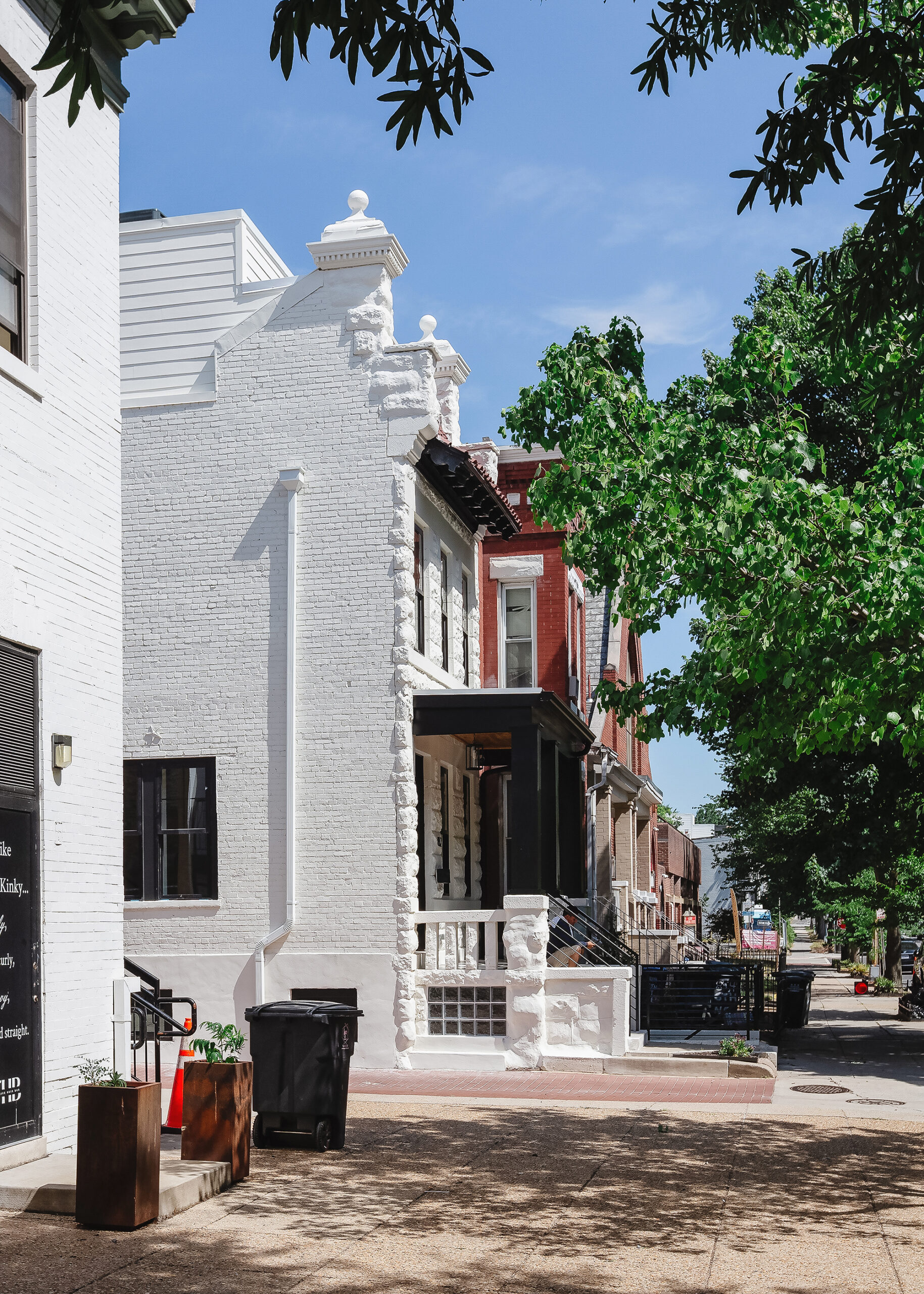 Pop-ups present a unique challenge: adding square footage to meet contemporary standards while preserving the character of the townhouse and the rhythm of the streetscape. To address this, the new volume was set back from the front façade to minimize its visibility from the street. This setback also allowed for a private terrace off the primary bedroom. At the rear, the new level includes a home office with a balcony and stair access to a roof deck, offering extended outdoor space and unobstructed views of Washington, DC.